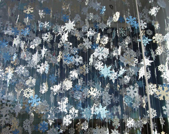 เกือบทุกคนชอบตัดเกล็ดหิมะดังนั้นเราจึงนั่งลงทุกคนที่เดินผ่านไปมาเพื่ออาชีพที่น่าพอใจและเราเองก็เชื่อมต่อเกล็ดหิมะด้วยกาวและด้ายทั้งในแนวตั้งหรือแนวนอน
