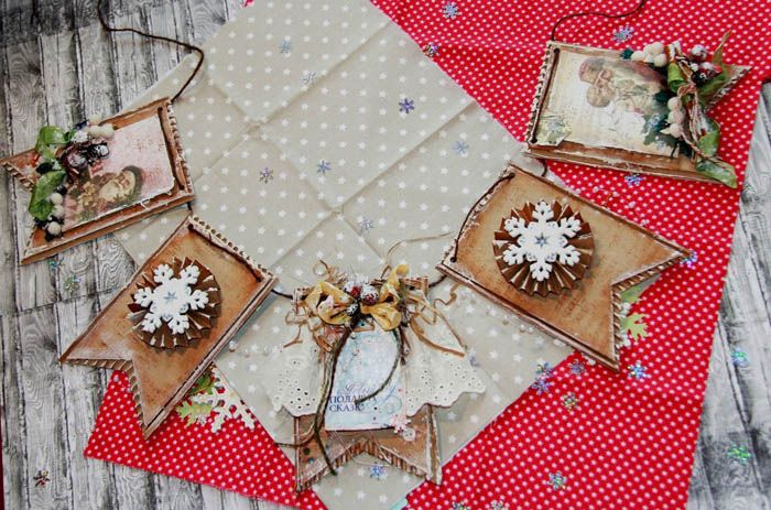Quilling ใช้ไม่ได้กับโปสการ์ดเท่านั้นแถบยาวแคบ ๆ จำนวนมากบิดเป็นองค์ประกอบและลวดลายได้อย่างง่ายดายจากนั้นจะประกอบเป็นเกล็ดหิมะอันเป็นเอกลักษณ์ดั้งเดิม แต่เกล็ดหิมะนั้นเชื่อมต่อกันเป็นมาลัย