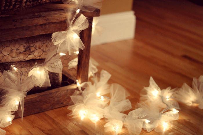 ทุกคนสามารถตกแต่งพวงมาลัยไฟฟ้าด้วยมือของพวกเขาเอง ในการทำเช่นนี้คุณจะต้องมีเศษของ Tulle หรือ Organza: เราห่อหลอดไฟแต่ละหลอดเป็นชิ้นเล็กชิ้นน้อยและมัดไว้ในถุง