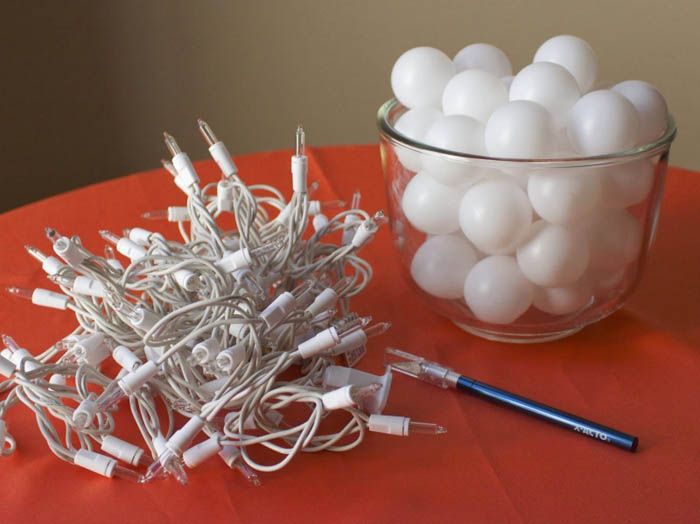 ง่ายแค่ไหนที่จะนำหลอดไฟมาร้อยพวงมาลัยด้วยมือของคุณเอง! เราซื้อลูกปิงปองหนึ่งกล่องและทำแผลรูปกากบาทเล็ก ๆ ในแต่ละอัน