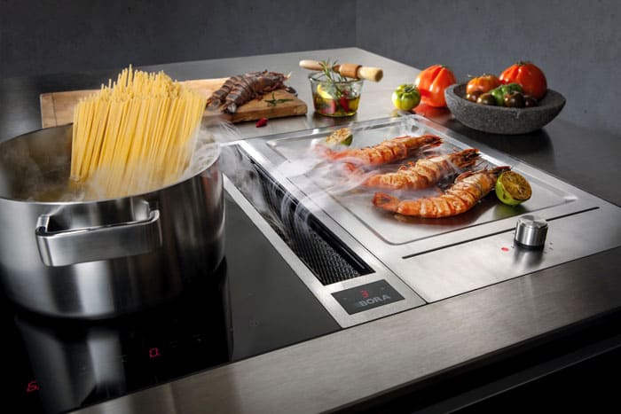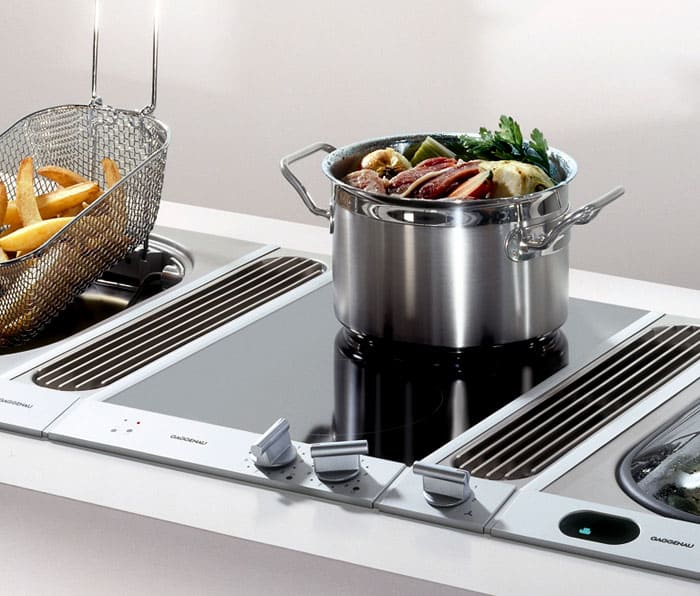 สามารถใช้เตาไฟฟ้าได้ เครื่องดูดควัน... นอกจากนี้ยังสามารถเป็นได้ทั้งในตัวและโดม โดยปกติแล้วเครื่องดูดควันในตัวจะติดตั้งไว้ที่พื้นผิวการทำงานของท็อปครัว ในกรณีนี้จำเป็นต้องคำนึงถึงการเพิ่มขึ้นอย่างมีนัยสำคัญของช่องว่างทางเทคโนโลยีที่สูงถึง 25-30 ซม. ใต้พื้นผิวของโต๊ะ