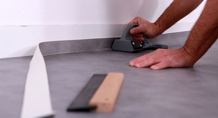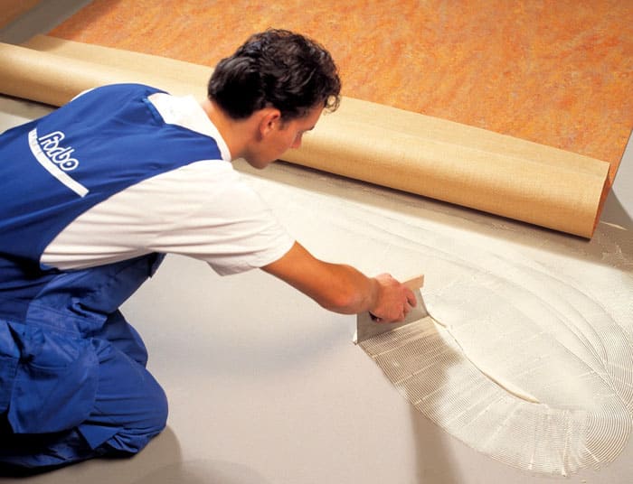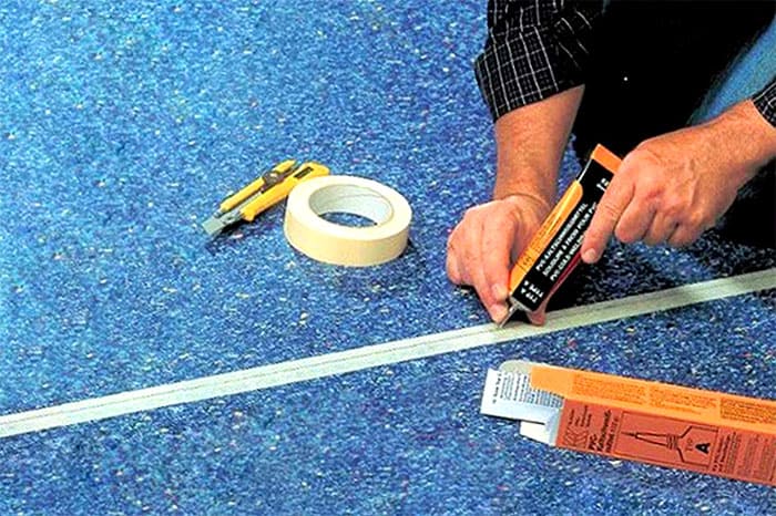 วัสดุปูพื้นพื้นที่ขนาดใหญ่และเสื่อน้ำมันเชิงพาณิชย์ติดกาวในส่วนที่เซ นอกจากนี้ต้องทำการยึดที่แข็งแรงเป็นพิเศษที่ข้อต่อ (ตะเข็บ) ระหว่างผืนผ้าใบ สำหรับสิ่งนี้กาวสองส่วนที่ทำปฏิกิริยาตาม อีพอกซีเรซิน หรือยูรีเทน ตะเข็บได้รับการแก้ไขเพิ่มเติมโดยการเชื่อมเย็นหรือร้อน