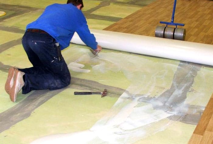 ในห้องเล็ก ๆ ตามกฎแล้วเสื่อน้ำมันปูด้วยผ้าใบทั้งผืน กาวถูกนำไปใช้ในชั้นต่อเนื่องทั่วพื้นผิวทั้งหมดของฐาน กาวที่ใช้น้ำเป็นตัวเลือกที่ดีที่สุดสำหรับวิธีการยึดนี้