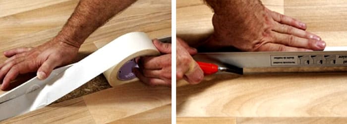 - เส้นรอยต่อถูกตัดไปตามผืนผ้าใบทั้งสองในเวลาเดียวกัน ใช้ไม้บรรทัดโลหะเป็นแม่แบบ