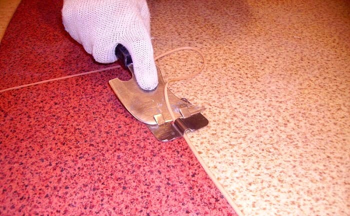 หากห้องมีขนาดใหญ่พอจำเป็นต้องเชื่อมต่อผืนผ้าใบเสื่อน้ำมันหลายผืน ในกรณีนี้จะดำเนินการต่อไปนี้: