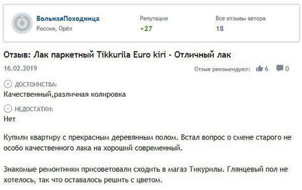 รีวิวของ Tikkurila Euro kiri เคลือบเงาไม้ปาร์เก้:
