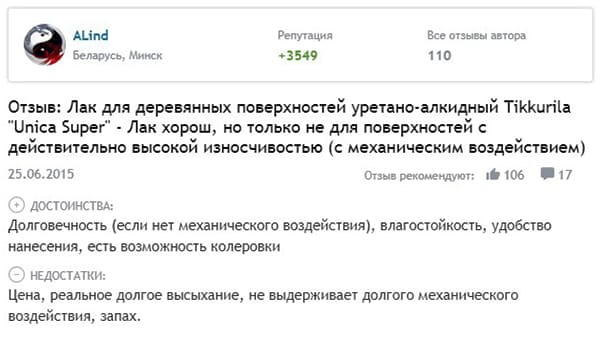 รีวิวน้ำยาเคลือบเงายูรีเทน - อัลคิด Tikkurila "Unica Super" สำหรับพื้นผิวไม้: