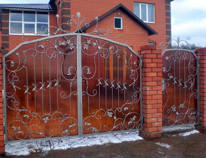 โพลีคาร์บอเนตไม่กลัวการเปลี่ยนแปลงของอุณหภูมิความชื้นสูงและแสงแดดโดยตรง วัสดุนี้จะช่วยปกป้องสนามของคุณจากฝุ่นถนนและใบไม้ร่วงลมได้อย่างน่าเชื่อถือ โพลีคาร์บอเนตไม่เข้าสู่ปฏิกิริยาใด ๆ และไม่ส่งผลให้เกิดสนิมบนรูปแบบประตูปลอม ตัวอย่างภาพถ่ายของการออกแบบดังกล่าว