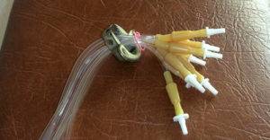 สำหรับการปฏิสนธิจะใช้หน่วยปฏิสนธิพิเศษหรือที่เรียกว่า Venturi injector คุณสามารถซื้ออุปกรณ์ปุ๋ยที่คล้ายกันหรือทำด้วยมือได้ หลักการทำงานของกลไกดังกล่าวคือการผสมน้ำกับปุ๋ยการติดตั้งโครงสร้างดังกล่าวเป็นสิ่งจำเป็นสำหรับการจัดหาปุ๋ยอย่างค่อยเป็นค่อยไปในท่อหลัก ชุดให้อาหารดังกล่าวประกอบด้วยท่อกรองและหัวฉีด
