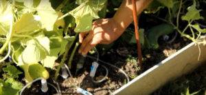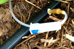 ภาพถ่ายแสดงการให้น้ำแบบเฉพาะจุดรวมถึงเส้นน้ำหยดที่ขยายไปทุกเส้น เตียง... เส้นเหล่านี้ทำโดยใช้ท่อพลาสติกหรือเทปน้ำหยดที่มีรู ในตอนท้ายของสายดังกล่าวจะมีการต่อปลั๊กหรือก๊อกน้ำ