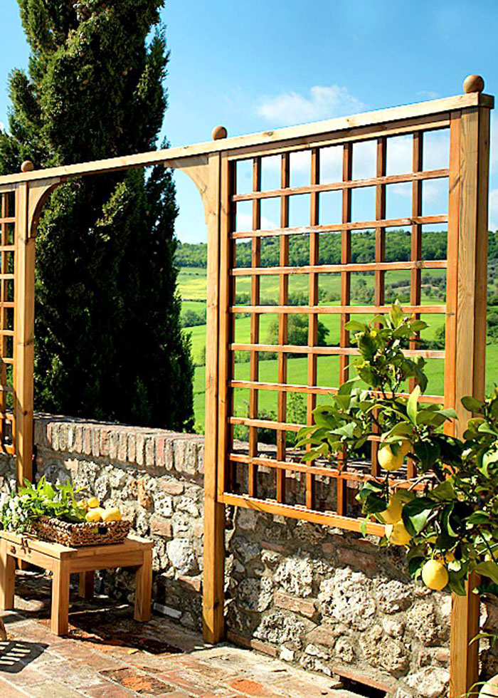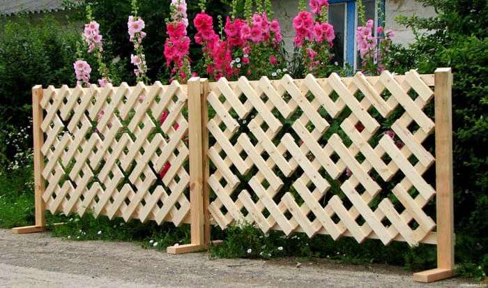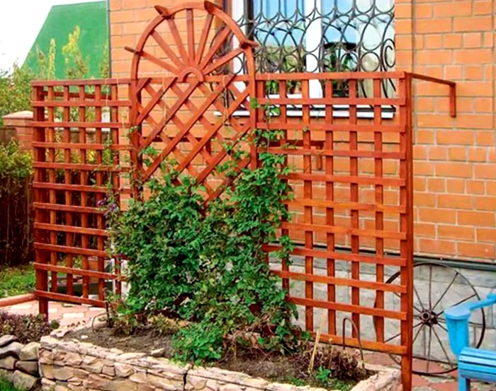 โครงสร้างบังตาที่ดูดีเป็นองค์ประกอบตกแต่งแยกต่างหาก สามารถปลูกพืชปีนเขาในกระถางดอกไม้ในบริเวณใกล้เคียง