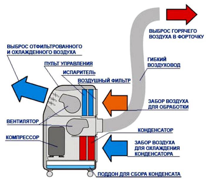 ก่อนอื่นเรามาดูการออกแบบยูนิตกันก่อน เครื่องปรับอากาศเคลื่อนที่ประกอบด้วยหน่วยในร่มสองชุด: คอนเดนเซอร์และเครื่องระเหย หม้อน้ำของอุปกรณ์จะรวมอยู่ในที่อยู่อาศัยเดียวโดยมีอิสระหมุนเวียนอยู่ภายในในเครื่องระเหยก๊าซสารทำความเย็นจะรับความร้อนจากกระแสอากาศในขณะที่กระบวนการย้อนกลับเกิดขึ้นในคอนเดนเซอร์