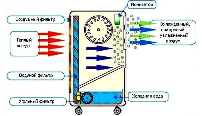 มวลอากาศถูกป้อนเข้าไปในบาดาลของอุปกรณ์โดยใช้พัดลมแบบแรงเหวี่ยง อากาศถูกจ่ายจากด้านบนสำหรับขั้นตอนการทำความเย็นจากด้านล่าง - เพื่อลดอุณหภูมิในคอนเดนเซอร์ มีถาดรองน้ำหยดที่ด้านล่างของอุปกรณ์