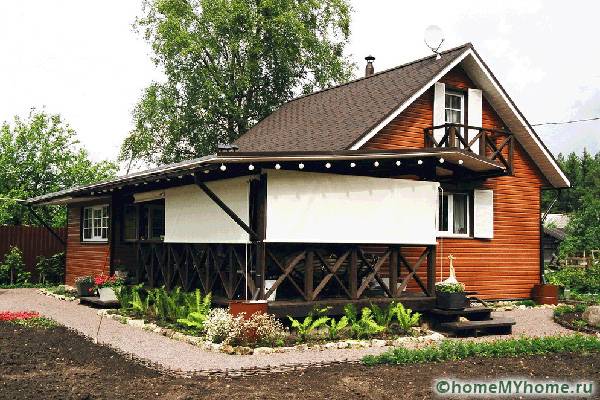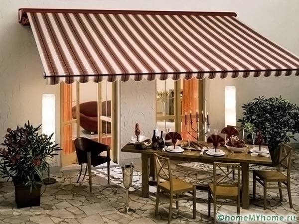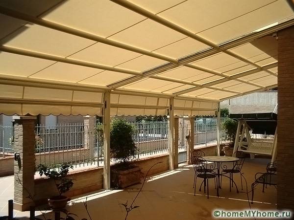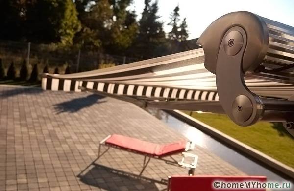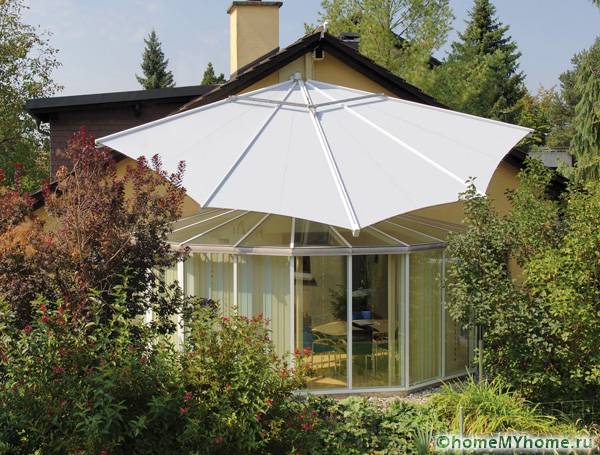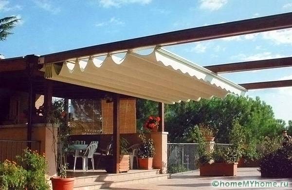 สำหรับอาคารชานเมืองจะใช้เฉดสีเดียวและสีอ่อน คุณยังสามารถเลือกผ้าที่มีลายหรือลายพิมพ์ได้ เนื้อผ้ามีความสำคัญ ความแข็งแรงของทรงพุ่มขึ้นอยู่กับวัสดุ ระบบกรอบ... แนะนำให้ใช้ท่ออลูมิเนียมกลวงจะดีกว่า วัสดุเหล่านี้จะช่วยป้องกันการกัดกร่อน เมื่อทำกันสาดคุณจะต้องมีท่อกลไกการพับและกันสาดที่ทำจากวัสดุที่ไม่ซีดจาง