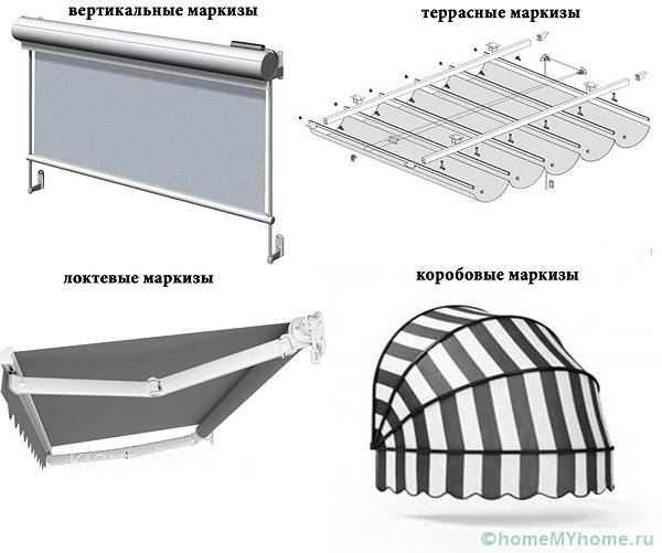กันสาดและกันสาดสำหรับระเบียงสามารถติดตั้งปุ่มกดหรืออุปกรณ์ที่มีสัญญาณวิทยุ กลไกการพับอาจเป็นแบบแมนนวลหรือแบบอัตโนมัติ ผลิตภัณฑ์ประเภทต่อไปนี้มีความโดดเด่น: