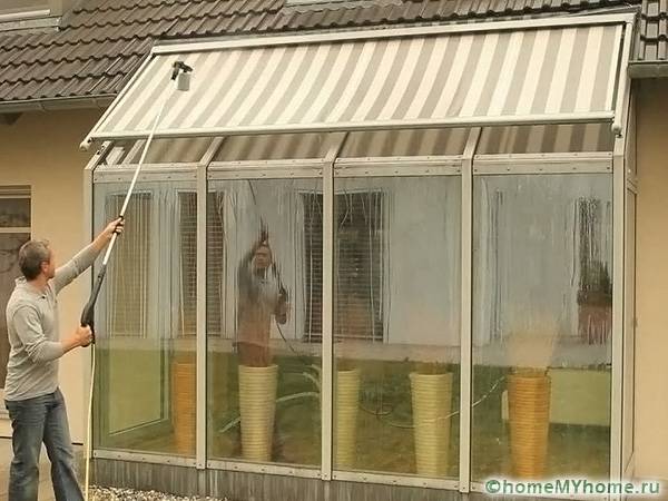 ข้อมูลสำคัญ! ในการทำความสะอาดแต่ละครั้งความต้านทานรังสียูวีของวัสดุจะลดลง ในการคืนค่าคุณสมบัติการป้องกันแสงแดดจะมีการใช้สารพิเศษซึ่งจะถูกนำไปใช้กับพื้นผิว