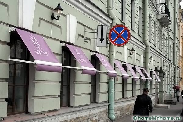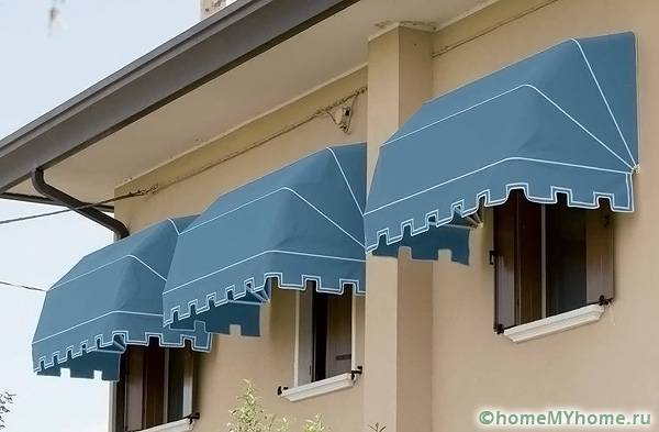 มีการติดตั้งกันสาดและกันสาดสำหรับระเบียงและเฉลียงที่ด้านหน้าของอาคาร อุปกรณ์เหล่านี้เป็นอุปกรณ์พิเศษที่ช่วยปกป้องห้องจากแสงแดด การออกแบบดังกล่าวในช่วงอากาศร้อนช่วยให้คุณลดอุณหภูมิในห้องหลักได้หลายองศา กันสาดหลากหลายประเภทส่วนใหญ่ทำจากวัสดุที่อ่อนนุ่มซึ่งติดตั้งเข้ากับฐานโครง สามารถพับได้ เพิงส่วนใหญ่มักมีอุปกรณ์ที่อยู่กับที่และทำจากวัสดุเช่นกระเบื้องโพลีคาร์บอเนตหรือโลหะ