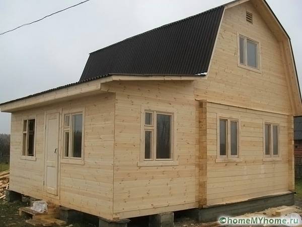 ตัวเลือกที่ประหยัดกว่าสำหรับฐานรากคือฐานรากเสาเข็ม ผนังถูกสร้างขึ้นจากคานโปรไฟล์ หลังจากติดตั้งแถวแรกแล้วพื้นผิวของต้นไม้จะได้รับการบำบัดด้วยสารฆ่าเชื้อ จากนั้นจะติดตั้งความล่าช้า ช่องว่างและรอยแตกเต็มไปด้วยวัสดุฉนวนความร้อนพิเศษ