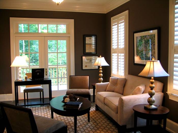 คุณไม่ควรใช้โทนสีน้ำตาลจำนวนมากในการตกแต่งห้องโดยใช้ร่วมกับสีอื่น ๆ เท่านั้นเนื่องจากจะทำให้เกิดความหดหู่ อย่าละเมิดและแดงซึ่งน่าตื่นเต้น โทนสีเทาอ่อนเหมาะสำหรับสำนักงานมากกว่าเนื่องจากแสดงถึงความสงบและความรุนแรง