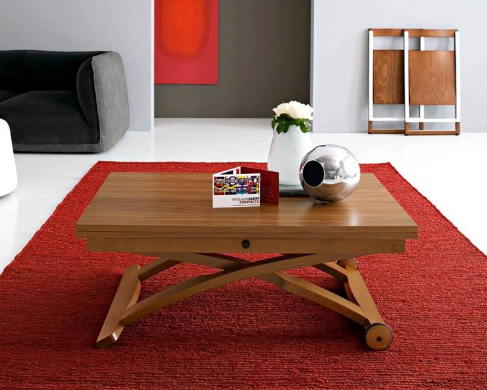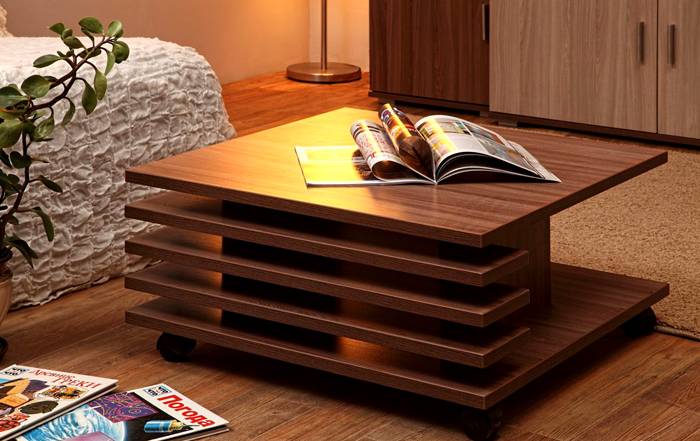 ตัวเลือกแรกเป็นแบบดั้งเดิมและง่ายต่อการซ่อมแซม ประการที่สองควบคุมได้ง่ายกว่า แต่ในกรณีที่เกิดการพังทลายกลไกดังกล่าวจะต้องถูกเปลี่ยนใหม่ทั้งหมด แยกต่างหากเป็นสิ่งที่ควรค่าแก่การเน้นรูปแบบของโต๊ะกาแฟหม้อแปลงบนล้อ สะดวกไม่เพียง แต่จัดวาง แต่ยังเคลื่อนย้ายไปรอบ ๆ ห้องได้อีกด้วย
