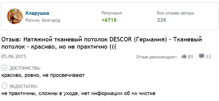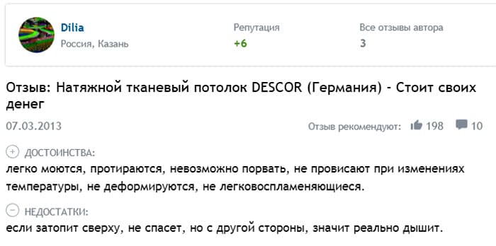 Има ли продукт някакви недостатъци? Има. Наложително е да се спомене херметичността. Заедно с въздуха платното преминава през вода. Ако съседите отгоре започнаха да ви заливат, тогава такова покритие няма да ви спаси от потопа.