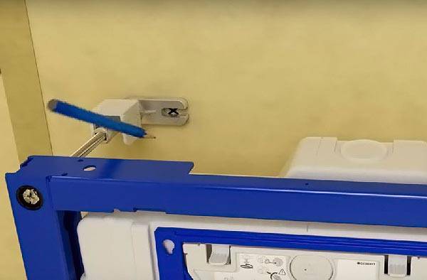 Adım 2 - çerçeve montajı ve işaretleme. Bu aşamada hareketli ünitelerin yani dikmelerin duvara tutturulabilmesi için sabitlenmesi, boylarının istenilen ölçüye ayarlanması gerekir. Bundan sonra, çerçeve duvara tutturulur ve seviye kullanılarak kesinlikle dikey olarak ayarlanır. Yatay çizgi, yapının altındaki yükseklik vidaları kullanılarak ayarlanır. Bundan sonra, gelecekteki deliklerin yerleri bir kalemle işaretlenir.