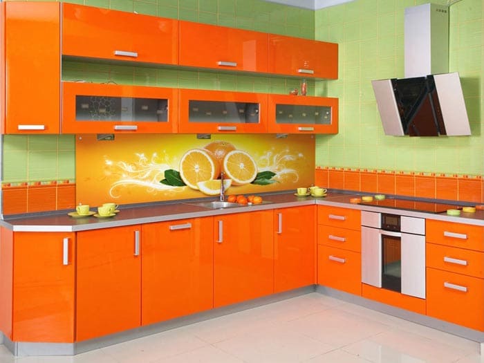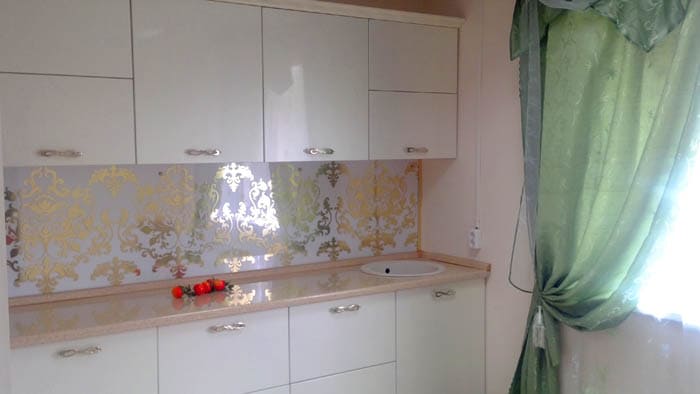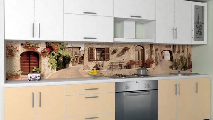 Desenli panelleri tercih edebilir misiniz? Bu bir bütçe dekorudur, ancak tasarım filme basılmışsa oldukça dengesizdir. Ve uygulama koruyucu bir vernik tabakası ile akrilik plastik üzerine yapılmışsa, böyle bir önlük daha uzun süre dayanır. Alternatif olarak, tasarım birkaç vernik katmanının altına gizlenebilir, sıcak kaplama yöntemi kullanılarak birlikte sinterlenebilir.