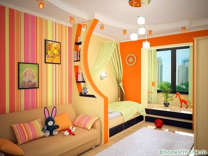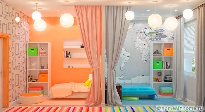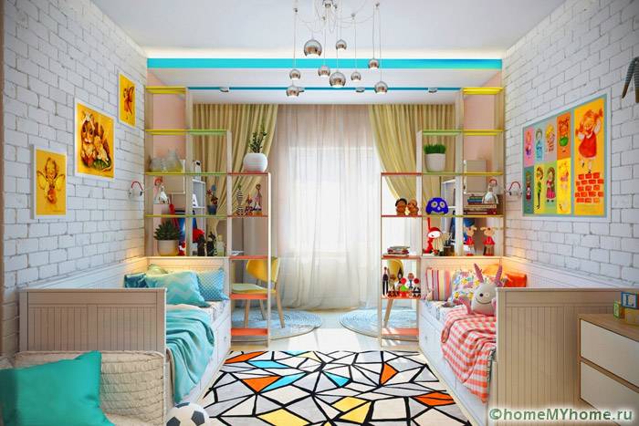 Ek raflar, gerekli tüm eşyaları ve oyuncakları yerleştirmenize yardımcı olacaktır. Gelecekte, bölme rekreasyon ve çalışma alanları için bir ayırıcı olarak kullanılabilir.