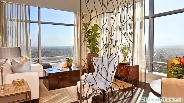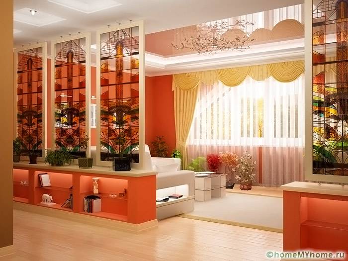 Dekoratif bölmeler, oturma odasını imar etmek için mükemmel bir çözüm olacaktır. Bu tür tesisler için, gerektiğinde açılan ve katlanan mobil yapılar kullanılır. Pleksiglas, plastik ve cam uygun malzemelerdir.