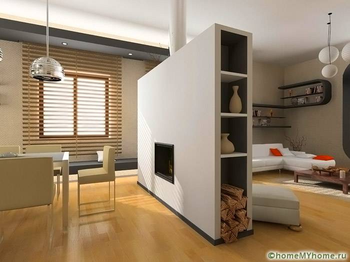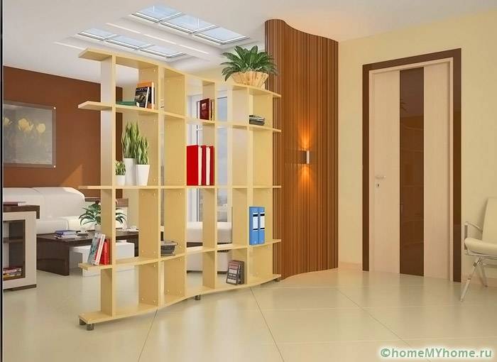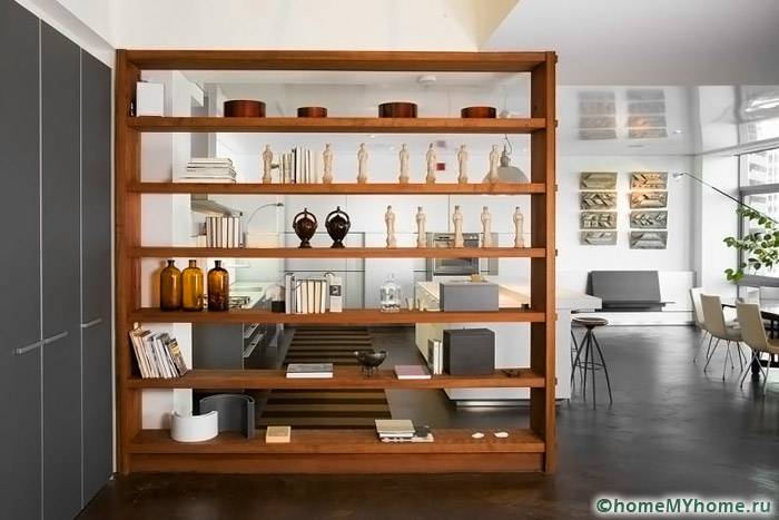 Raflara vazolar, hediyelik eşyalar ve kitaplar yerleştirilmiştir. Bu tür yapıların içine bir akvaryum, TV ve hatta bir şömine koyabilirsiniz. Bu durumda bir tarafa oturma alanı ve diğer tarafa yemek odası yerleştirilebilir.