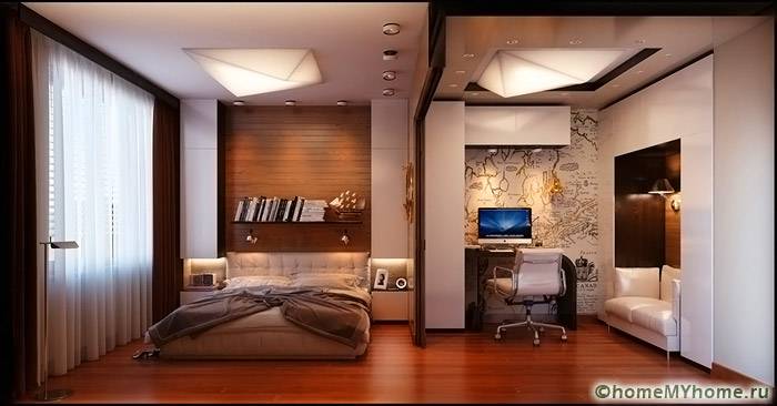 Odadaki işlevsel alanı imar etmek için cam bölmeler yardımıyla iş veya çalışma için ayrı bir yer ayırabilirsiniz. Bu durumda uyuma yeri ve alanı çalışma masası ile bölebilirsiniz.