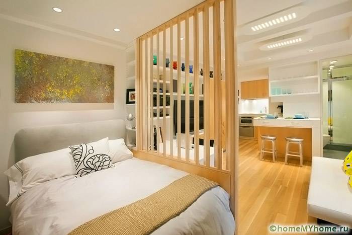 Bir bölme takmak daha şık ve işlevsel bir iç mekan yaratacaktır. Bu durumda, alan birkaç bölgeye ayrılmıştır.