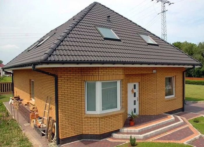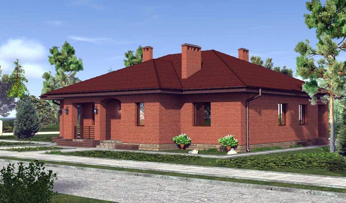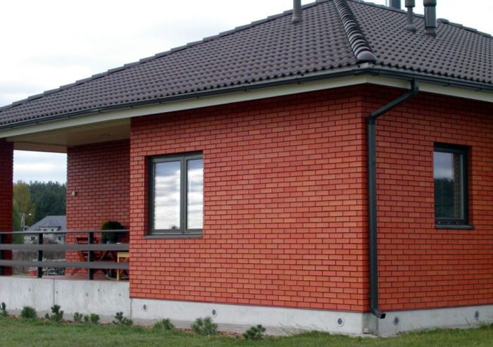 Tek katlı veya başka bir tuğla evin fotoğrafı yalnızca estetik parametreleri gösterir. Proje teknik özellikleri incelemelidir. Cilanın dayanıklılığı ve bakım programı çok önemlidir.