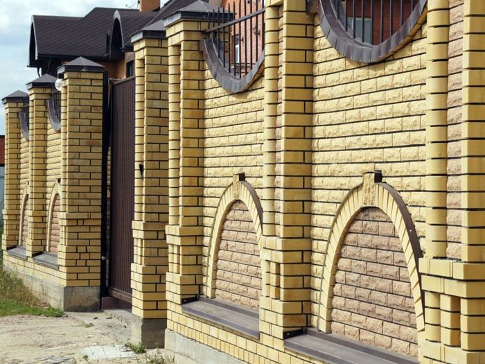 Bu fotoğraf sarı tuğladan bir çit gösteriyor. Arazide farklı mimari yapılar oluşturmak için muhteşem zıt renk kaplamaları tekrar edilebilir