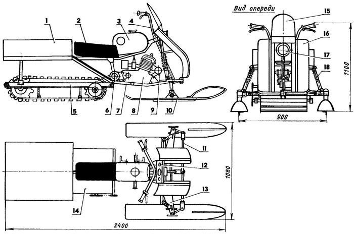 Kendinden tahrikli makinenin motorlu testereden hareketi için dürtü, kızağı ileriye doğru iten kancalı tırtıllar tarafından iletilir. Rayları 7-8 bıçaklı bir kürekle değiştirebilirsiniz, koltuğun altına monte edilir. Motor montajı prensibi, bir kar motosikletindeki ile aynıdır - bir motosikletten veya mopedden tahrik ve dişliler ile.