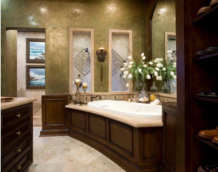 Sıvı duvar kağıdına cesur ve sıra dışı bir çözüm denilebilir. banyo dekorasyonu... Bu oda, nemli bir atmosfer ve sıcaklık değişiklikleri ile karakterizedir. Bu nedenle duvar ve zemin kaplamaları seçiminde özel dikkat gösterilmelidir. Bu durumda sıradan duvar kağıdı çalışmayacaktır. Yüksek kaliteli yapıştırıcı kullanmanız koşuluyla, birkaç ay bile dayanmazlar. Ancak sıvı duvar kağıdı başka bir konudur. Belirli banyo koşulları için harika oldukları ortaya çıktı.