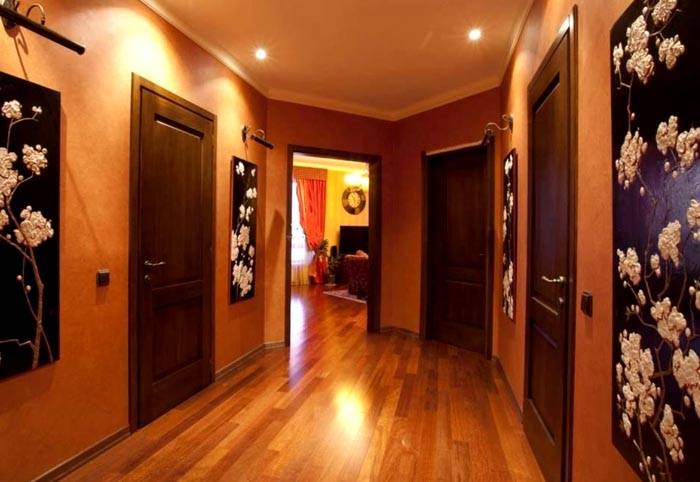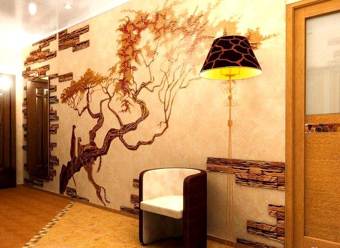 Koridorda, selüloz sıva kullanarak üç boyutlu çizimler bile oluşturabilirsiniz. Ancak her şey ölçülü olmalıdır. Duvardaki çok "süslü" çizim, küçük bir alanda ağır görünecektir.