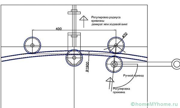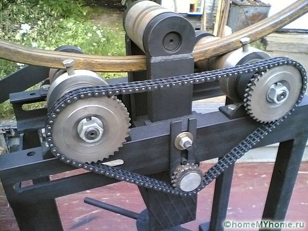 Избраният елемент се обработва по валцуване по определен начин. Частта е инсталирана на ролки и фиксирана в желаното положение. Когато дръжката се движи, веригата се движи и движи валовете. В резултат на това профилната тръба се огъва в дадена и желана посока.