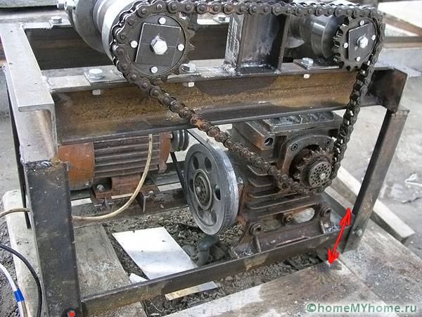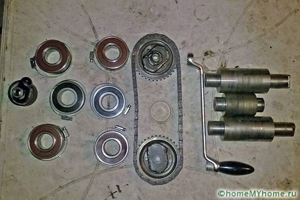 - Конструкцията на напорния вал е монтирана на специални пружини. Страничните валове са закрепени с верига. Дръжката също е заварена, което отговаря за въртенето.