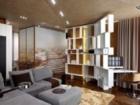 Các vách ngăn trượt, giá đỡ nhẹ, đi qua và màn hình - một tùy chọn khác, cách chọn một vùng trong một không gian duy nhất. Thủy tinh, gỗ, kim loại rèn, vải, tre - hầu hết mọi vật liệu đều thích hợp cho việc này. Thuận tiện, tất cả các vách ngăn này có thể dễ dàng tháo gỡ nếu cần, ví dụ như nếu bạn cần tổ chức một bữa tiệc.