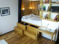 Các ngăn kéo có thể được giấu trong bục hoặc Giường... Và trên cùng - lắp đặt bàn ăn hoặc bàn làm việc. Chiều cao của bục là từ 30 cm, điều này là đủ để chứa giường, lên đến 1,5 m - ở đây bạn có thể sử dụng tủ quần áo đầy đủ. Một bục cao có thể là cơ sở cho một bến.