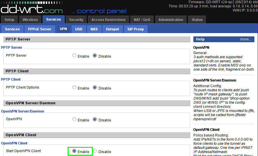 - Tất cả các giao thức máy chủ VPN được kích hoạt trên bộ định tuyến trong tab Dịch vụ -> VPN-> Máy khách OpenVPN.