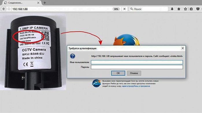 - Bất kỳ trình duyệt nào (Chrome, Mozilla, Opera) đều được khởi chạy trên PC và địa chỉ IP của camera được chỉ định tại nhà máy được nhập vào thanh địa chỉ của nó. Địa chỉ có thể được đóng dấu trực tiếp trên bảng tên của chính máy ảnh, ghi trên bao bì hoặc trong hộ chiếu của thiết bị.