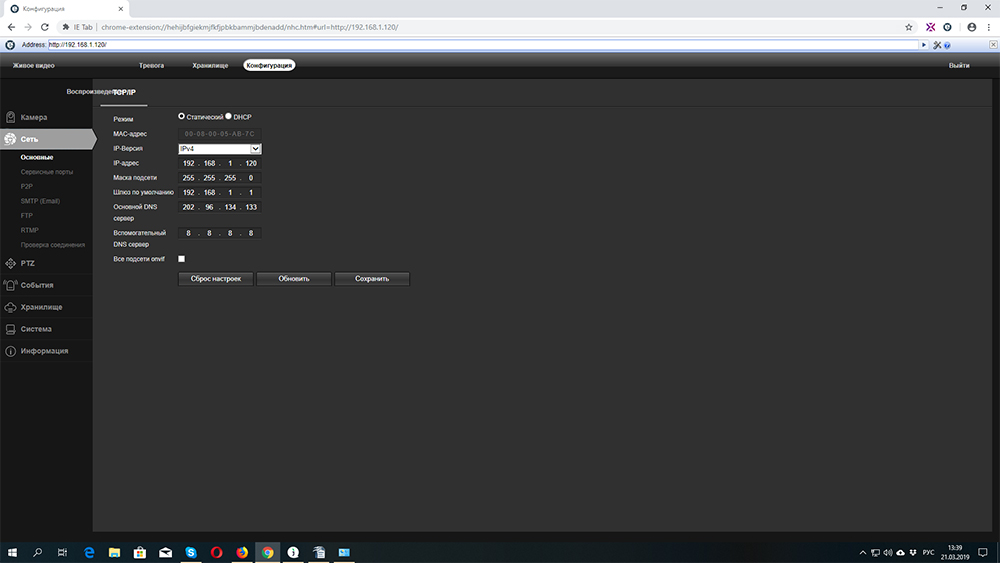 - Sau khi vào giao diện web của máy quay video, bạn cần chuyển đến tiểu mục "cài đặt mạng" "Địa chỉ IP" và trong trường tương ứng nhập địa chỉ IP do nhà cung cấp cung cấp theo cách thủ công.