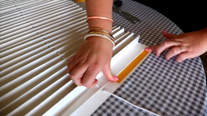 Mỗi lần vệ sinh cửa sổ sẽ bắt đầu bằng việc tháo rèm thủ công. Không xé băng dính hai mặt ra khỏi giấy, và có thể bị hỏng nếu rèm bị xé ra khỏi khung. Chúng tôi đưa ra giải pháp này: Đầu tiên, ngay sau khi đàn accordion sẵn sàng, chúng tôi dán một dải băng dính một mặt thông thường lên cạnh trên của nó và ở mặt nhẵn này, chúng tôi dán băng dính hai mặt.