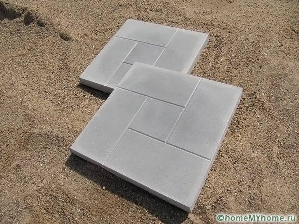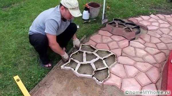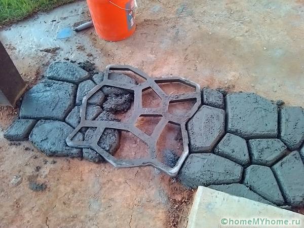 За да направите това, трябва да подготвите равномерна пясъчна основа. Формата се поставя с лицето надолу. През дупките се изсипва малък слой чакъл и след това се излива с бетон. За да може повърхността да стане гладка, е необходимо сместа да остане да изсъхне добре, в противен случай краищата могат да се окажат разкъсани. Формата трябва да бъде поставена възможно най-плътно към завършената плочка. Можете да използвате няколко формуляра наведнъж.