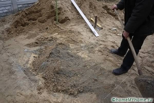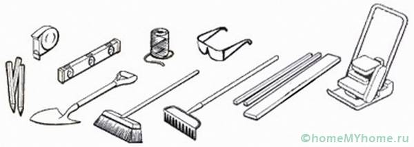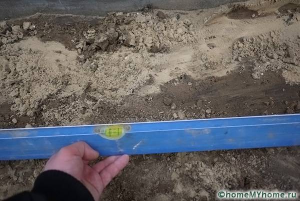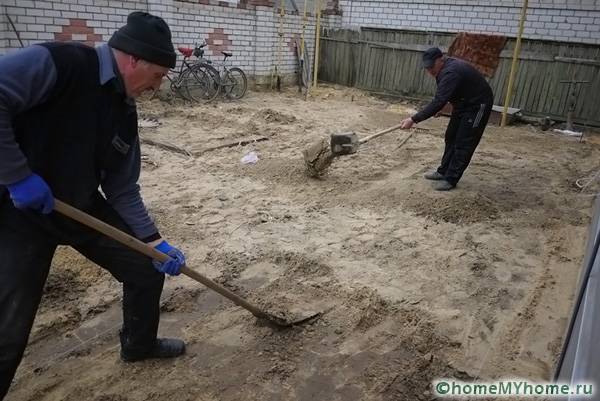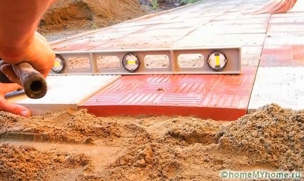 Преди да започнете работа, трябва да направите сайта на ниво. Отстранете излишната почва с лопата, запълнете дупките и ги изправете с гребло. Ако почвата е мека, тя се навлажнява с вода; малки неравности ще помогнат за премахване на пясък. Основата трябва да бъде около 3 см по-дълбока от планираното, тъй като почвата ще се свие под тежестта. Когато почвата е готова, върху нея се изсипва пясък. Ще се изисква много от този материал: слоят трябва да бъде най-малко 20 см. Пясъкът трябва да бъде добре изравнен и набит: можете да гледате процеса на подготовка във видеото за полагане на тротоарни плочи със собствените си ръце (инструкции стъпка по стъпка за процеса).