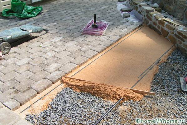 Наклонът е най-добре да се прави надлъжно напречно. Ако планирате да поставите някакви комуникации, те трябва да бъдат извършени на този етап от работата. За да не покълнат плевелите между фрагментите, е необходимо да се положи слой геотекстил... За да може пясъкът да стане гладък, той може да се търкаля с помощта на подготвена тръба. Натъпканият слой се разточва като тесто. За да бъде по-здрав бъдещият тротоар, основата трябва да бъде покрита с трошен камък или запълнена с циментов разтвор. За тази процедура се използва смес от пясък и цимент. След това натрошеният камък се покрива с допълнителен слой пясък, който също трябва да се трамбова.