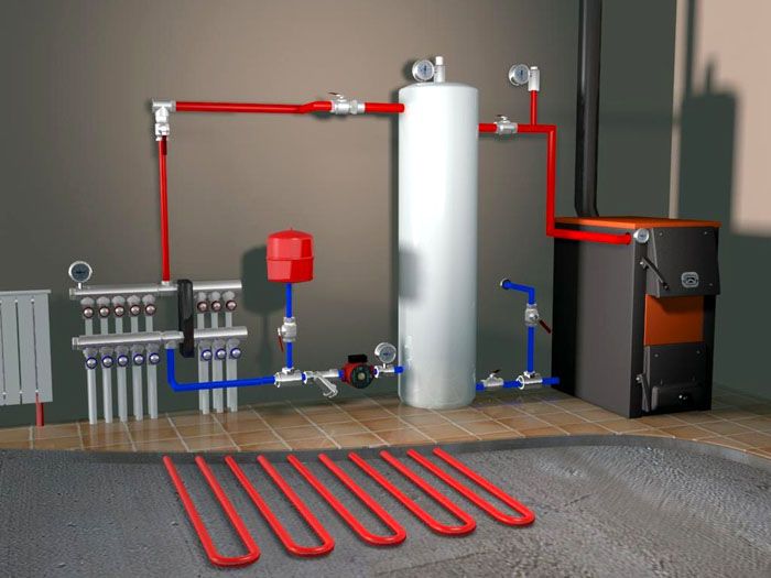 - цялото оборудване с изключение на радиаторите и тръбопроводите може да бъде скрито. Тоест, да се организира котелно помещение в офиса и да се скрият тръбите в канали по стените или в пода. Използвайки системи за подово отопление обикновено решава проблема със скритата инсталация. Дори радиаторите няма да се виждат;