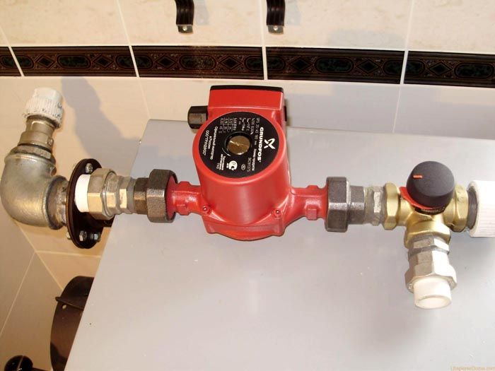 Внимание! Помпата трябва да бъде инсталирана на обратната верига близо до котела. Именно в тази област температурата на охлаждащата течност е най-ниската. И това е важно за помпата или по-точно за нейните гумени уплътнения и маншети, които просто не могат да издържат на високи температури. Те ще започнат да се свиват и да се пукат, което води до течове и повреда на помпения агрегат.